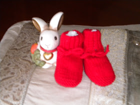 Le ho realizzate con una lana baby di un bel rosso vivo , spara un po' nella foto, ma ho provato parecchio e questo è il risultato migliore ( o meno peggio :) ).